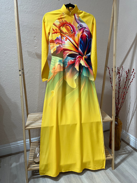 A15 - Áo Dài Chiffon 4 Tà Kết hạt cùng tông Yellow. Final sale (no return/exchange).
