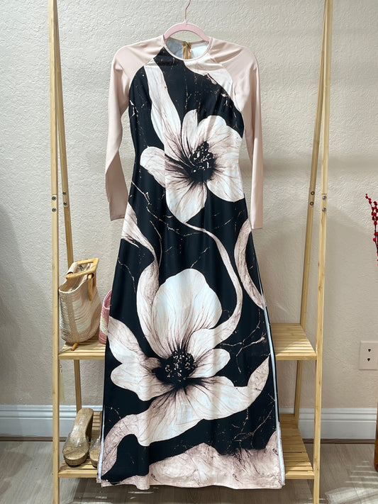 A17 - Áo Dài Chiffon 4 Tà Kết hạt cùng tông Black. Final sale (no return/exchange).