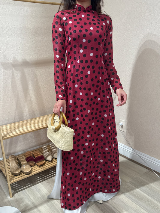 A45 - Áo Dài Gấm Tằm 2 Da Đỏ Nâu Tím (Cổ Gợn Sóng)