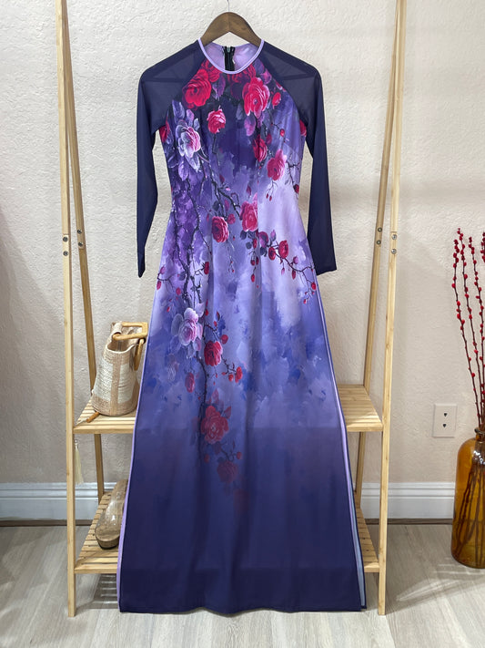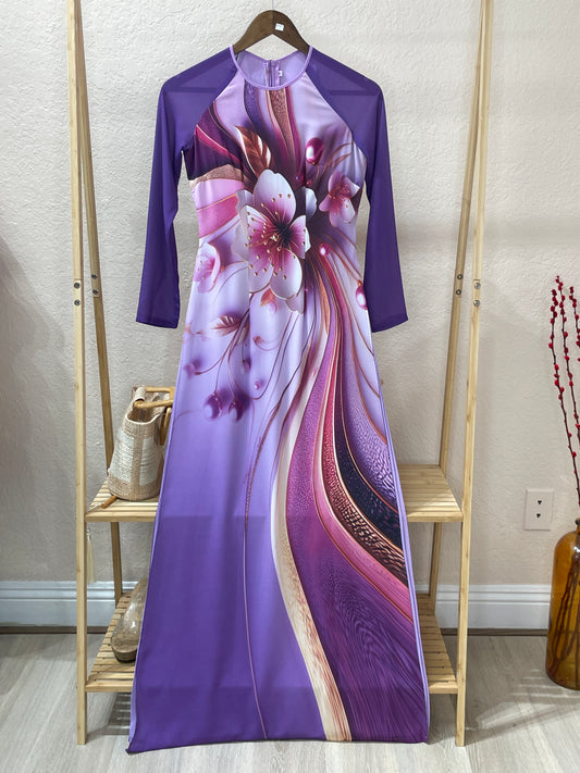 G3 - Set Áo Dài Bé Gái Tơ Tencel 4 Tà Tím Đỏ/Kem (kèm quần)