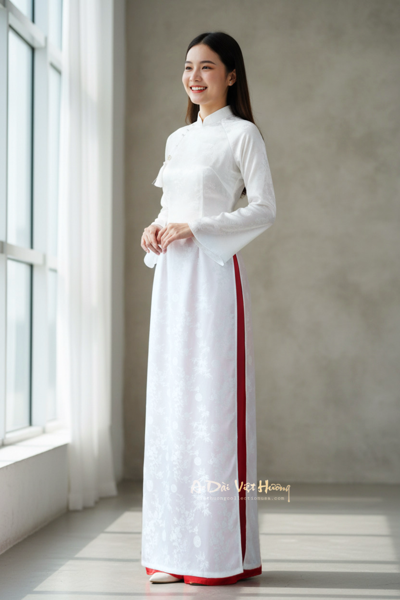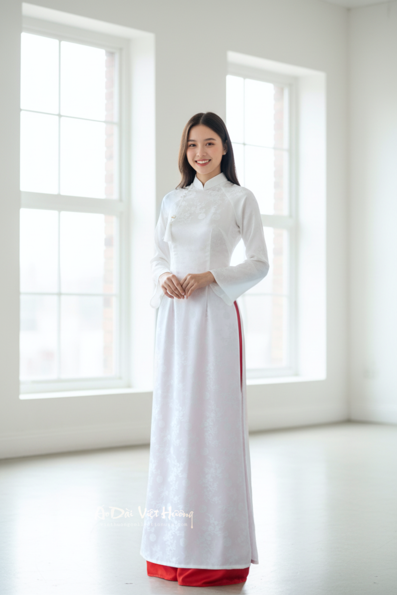 A103 - Áo Dài Gấm Lụa Trúc Đào Trắng