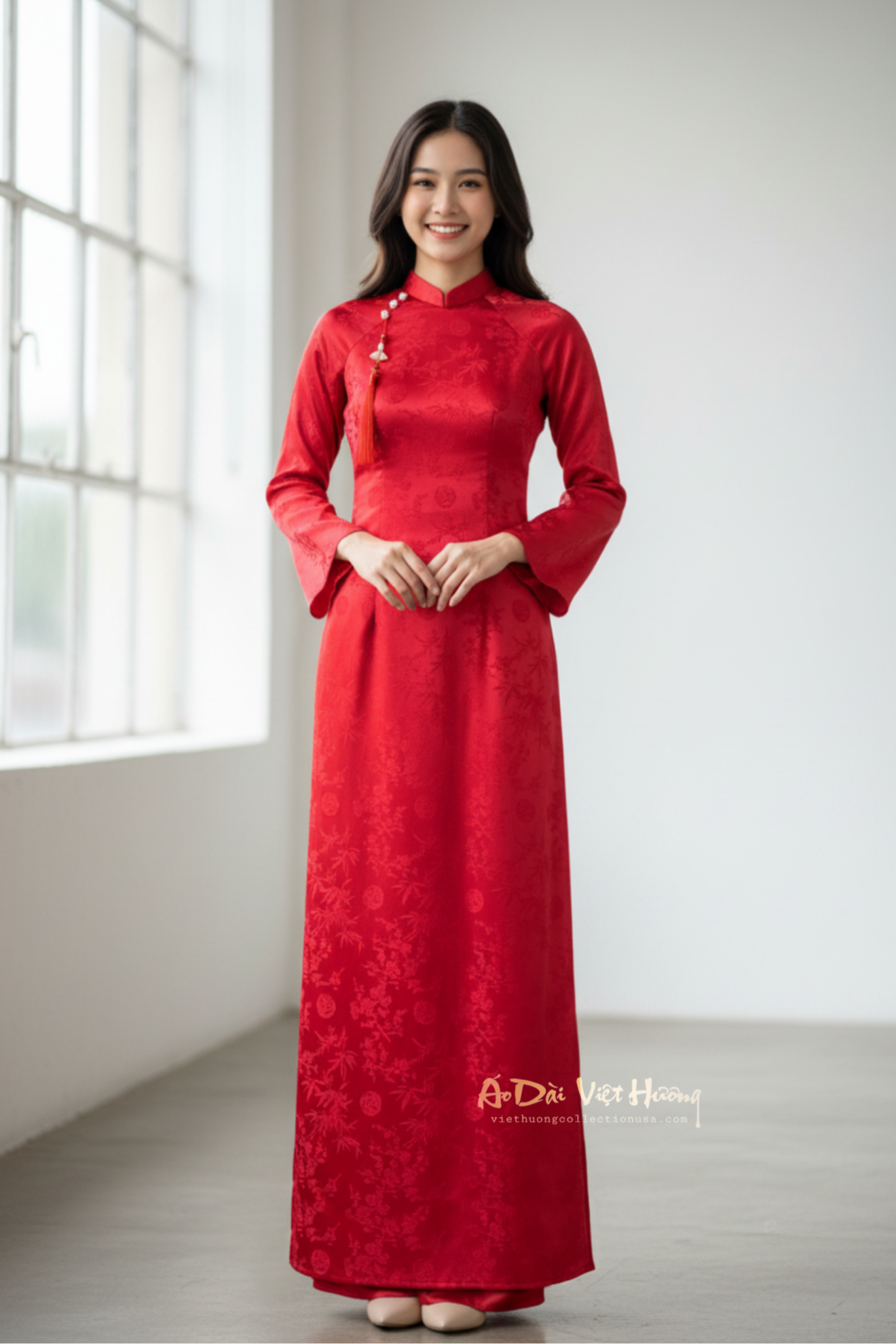 A104 - Áo Dài Gấm Lụa Trúc Đào Đỏ Tươi