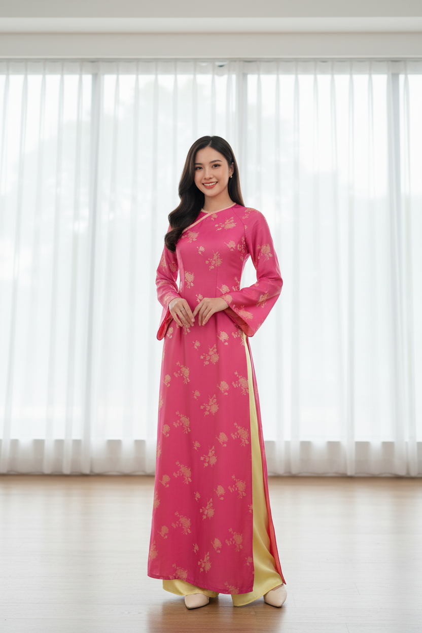 A116 - Áo Dài Lụa Gấm Thiên Cúc Hồng Sen