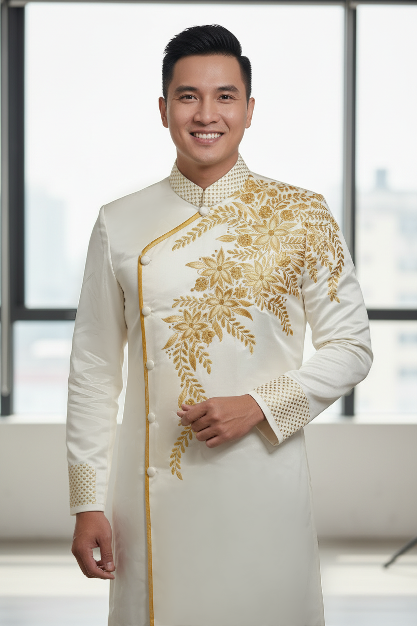 A119 - Men’s Áo Dài Vẽ Tay Off-white