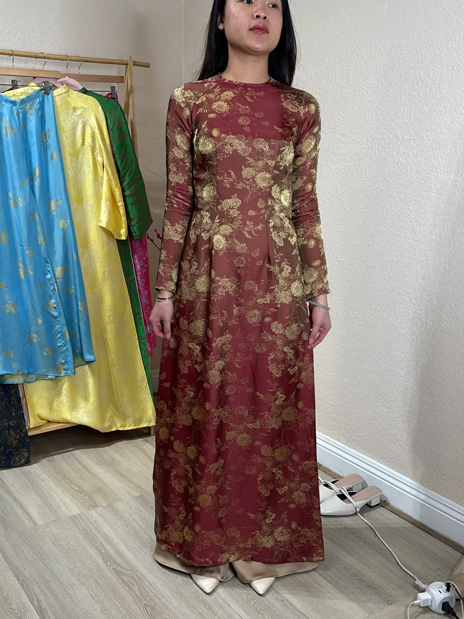A44 - Áo Dài Gấm Tằm 2 Da Đỏ Nâu Tím (Cổ Tròn)