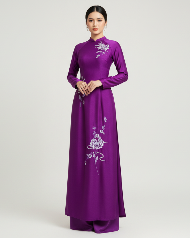 A65 - Áo Dài Lụa Ánh Sao Tím Thêu Hoa