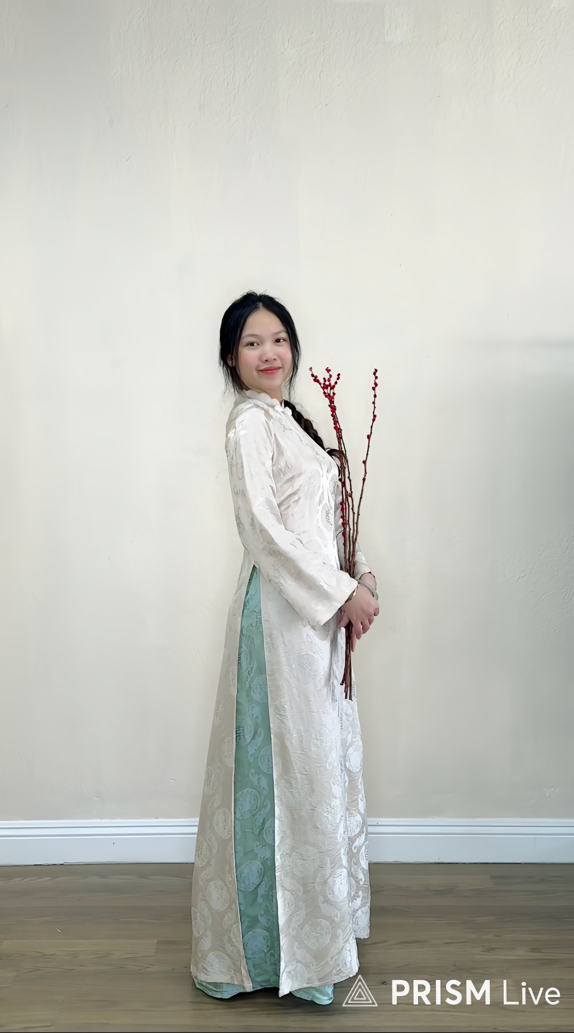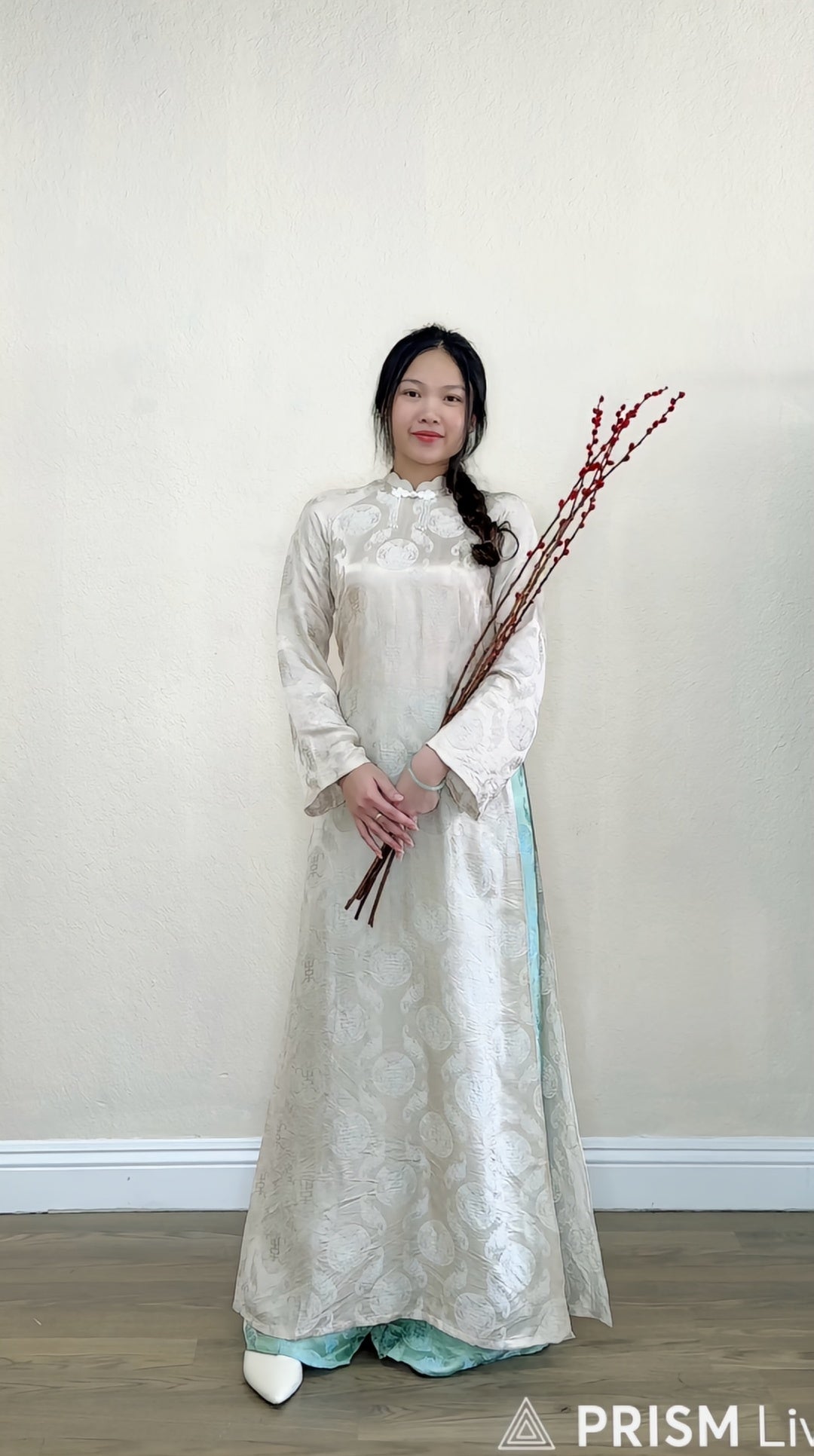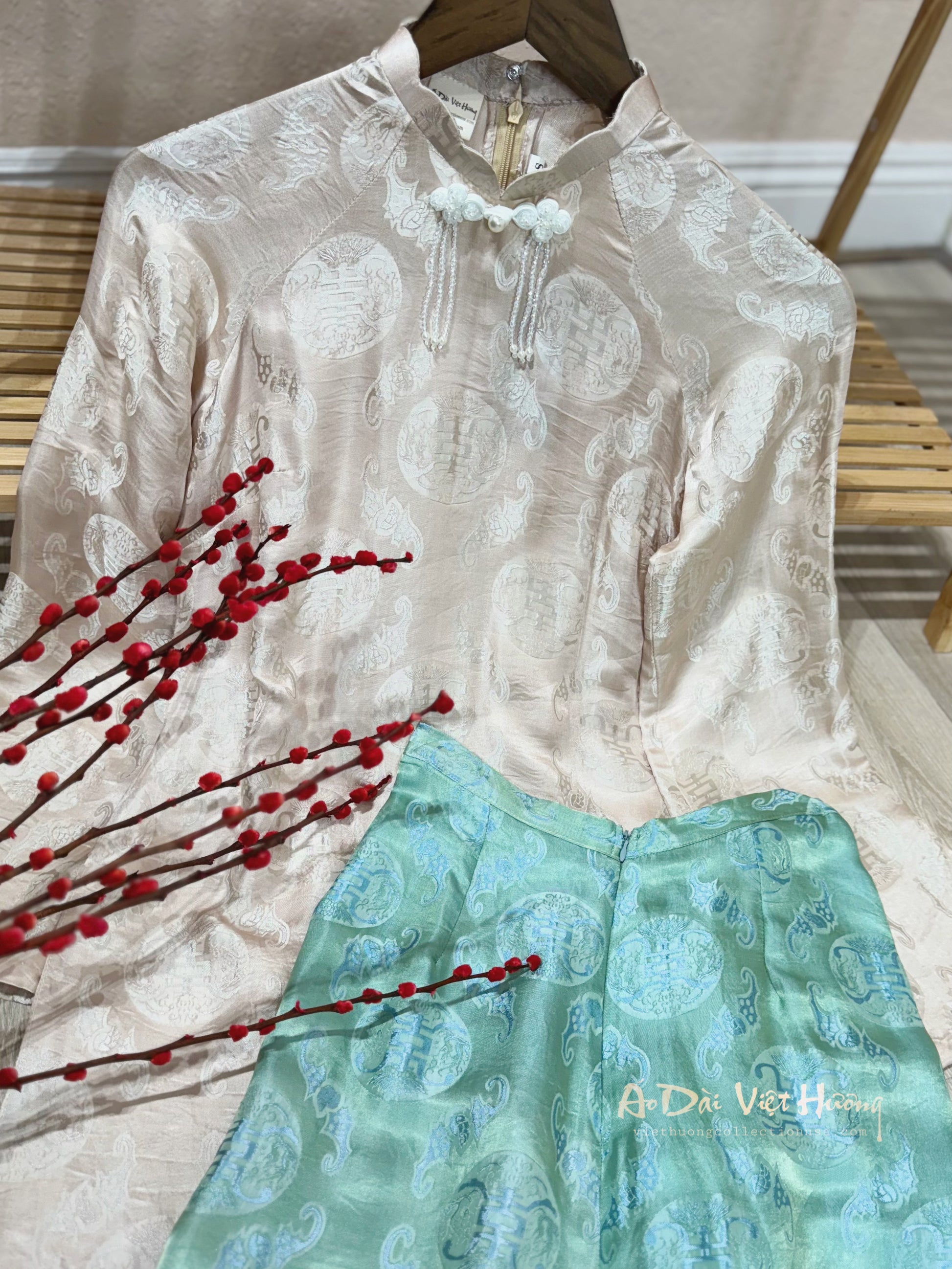 A04 - Set Áo Dài Tơ Tằm Nha Xá Thọ Dơi Kem + Quần Xanh Ngọc