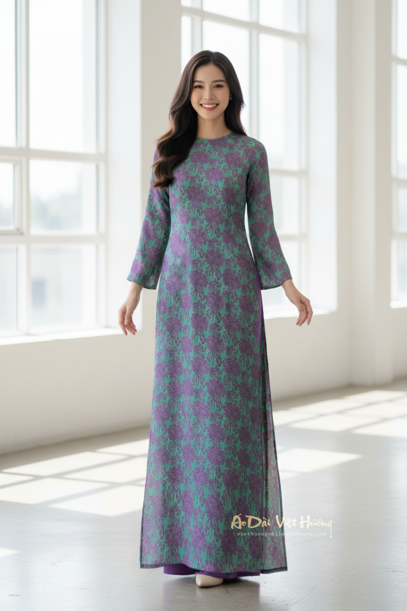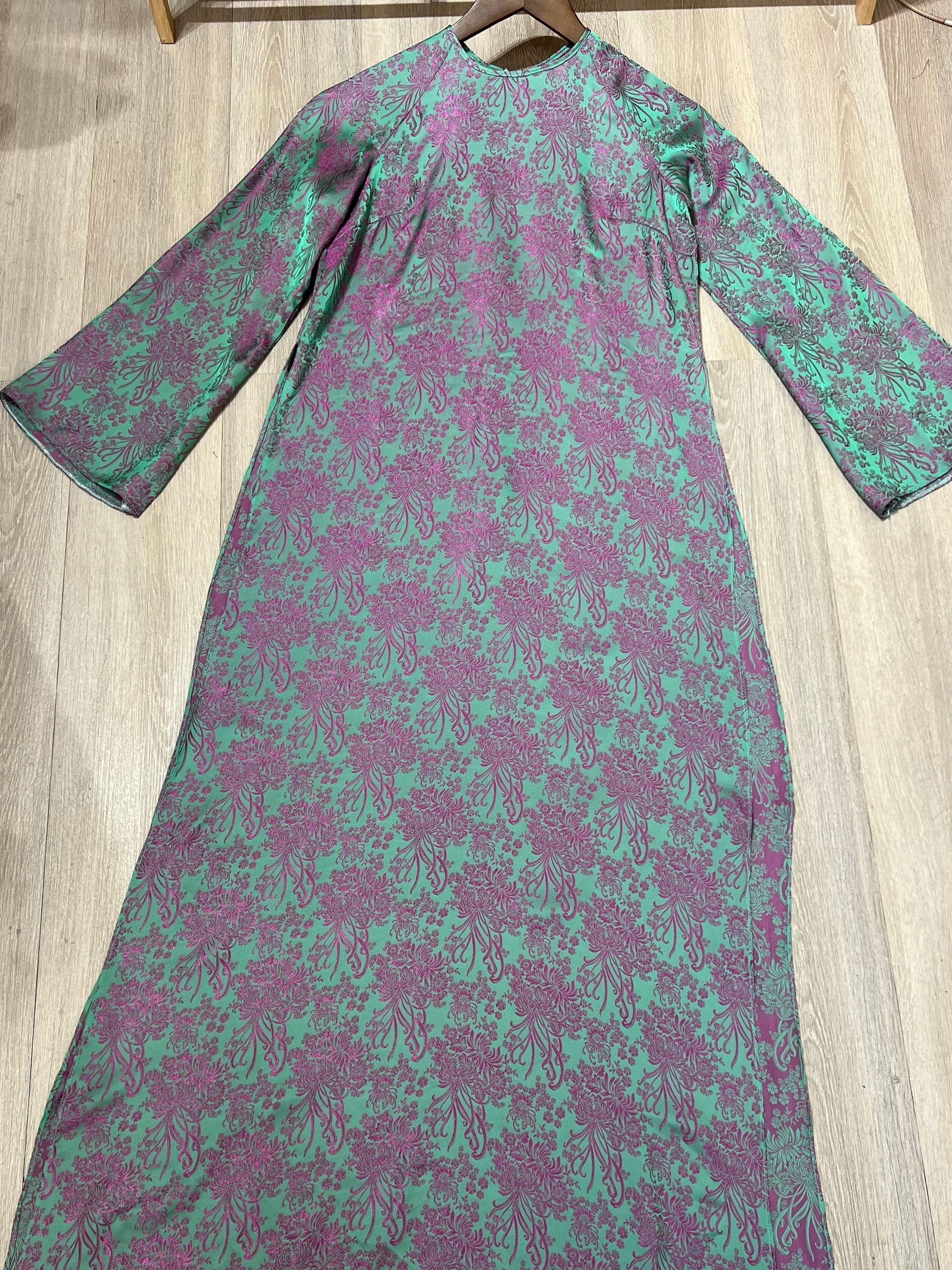 A142 - Áo Dài Suông Gấm Cúc Đại Đoá Xanh/Tím (Cổ Tròn) | Áo Only