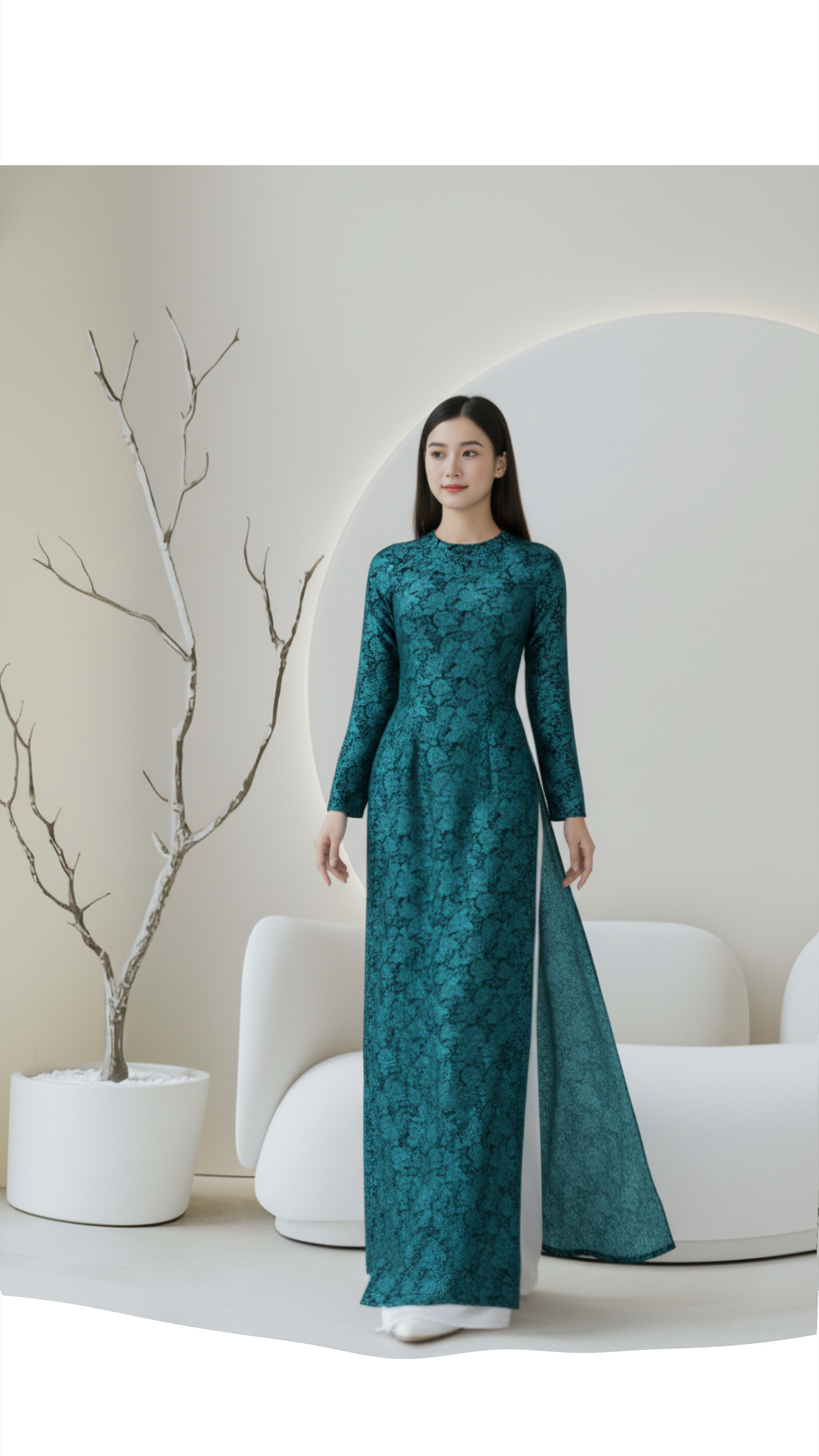 AD49 - Áo Dài Gấm Thái Tuấn Thiên Hoa Xanh Đen hoa Xanh Công (Cổ Tròn). Final sale (no return/exchange).