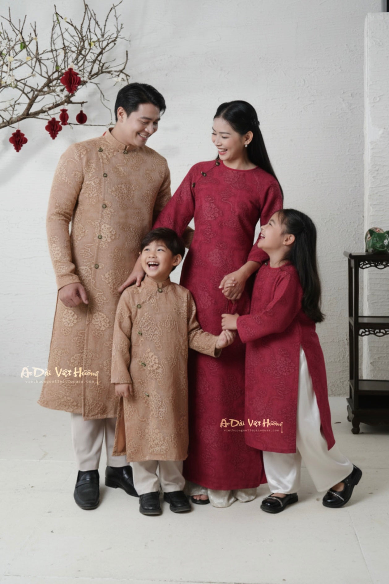 D8 - Girl’s Áo Dài Tơ Mành Vân Mây 4 Tà (kèm quần nhũ trắng)