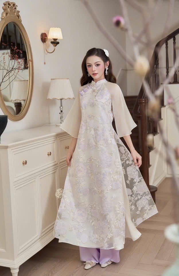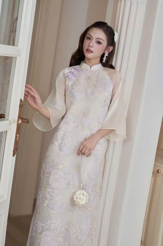 M8 - Áo Dài Cách Tân Tơ Thêu 4 Tà Tím | Áo Only